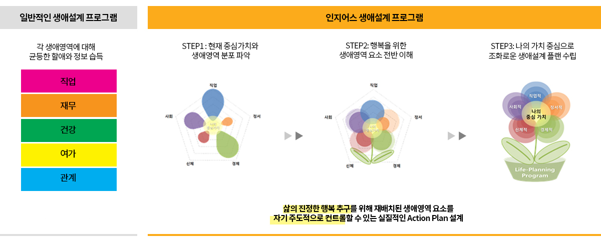 인지어스 생애설계 프로그램은 개인의 중심가치에 따른 맞춤형 생애설계 프로그램입니다.