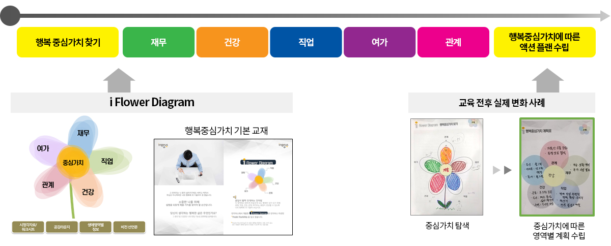 각 영역에서 환하게 웃음짓게 되는 행복한 내가 되기 위해 재무, 직업, 건강, 여가, 관계 라는 꽃잎이 번성 할 수 있도록 나의 행복에 귀 기울여 보십시오.