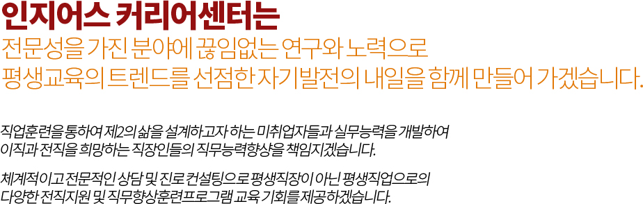 그 결과로 직업훈련에 대한 수요를 충족시키고 양질의 교육서비스를 강화하기 위해 인지어스 커리어센터를 설립하게 되었습니다.
