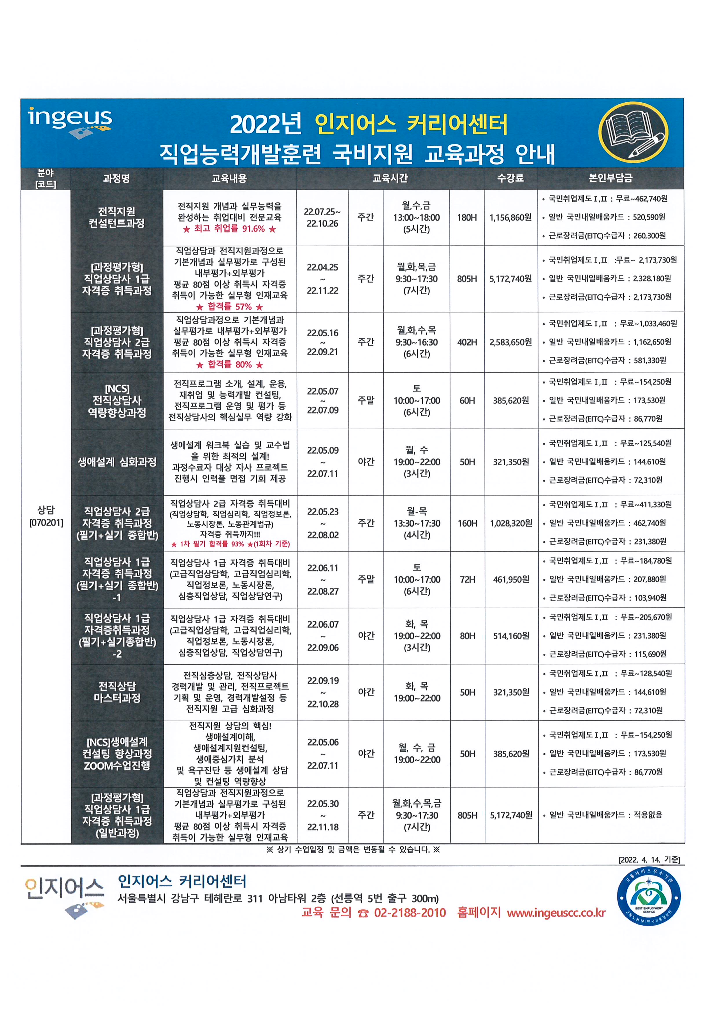 2022년 인지어스 커리어센터 전체 국비과정 안내