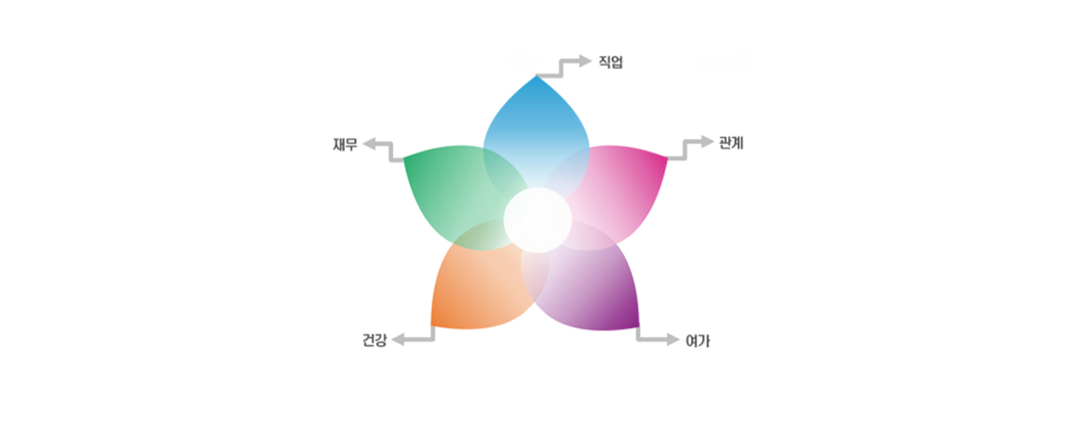 각 영역에서 환하게 웃음짓게 되는 행복한 내가 되기 위해 재무, 직업, 건강, 여가, 관계 라는 꽃잎이 번성 할 수 있도록 나의 행복에 귀 기울여 보십시오.